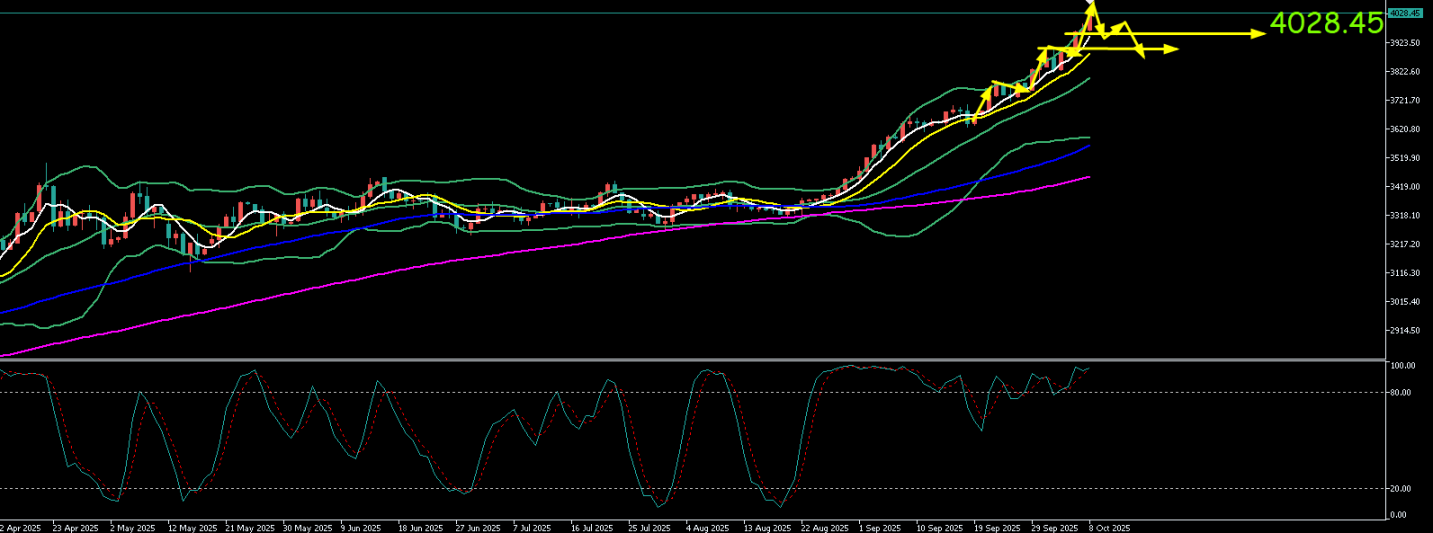 黄金周二(10.7)最高上探至3991.05美元/盎司,最低触及3940.78美元/盎司。收盘于3960.76美元/盎司,周三(10.8)开于3984.3元/盎司,截至目前最高上探至4037.2美元/盎司,最低触及3955.73美元/盎司,行情冲高回落,现报价3984.3。